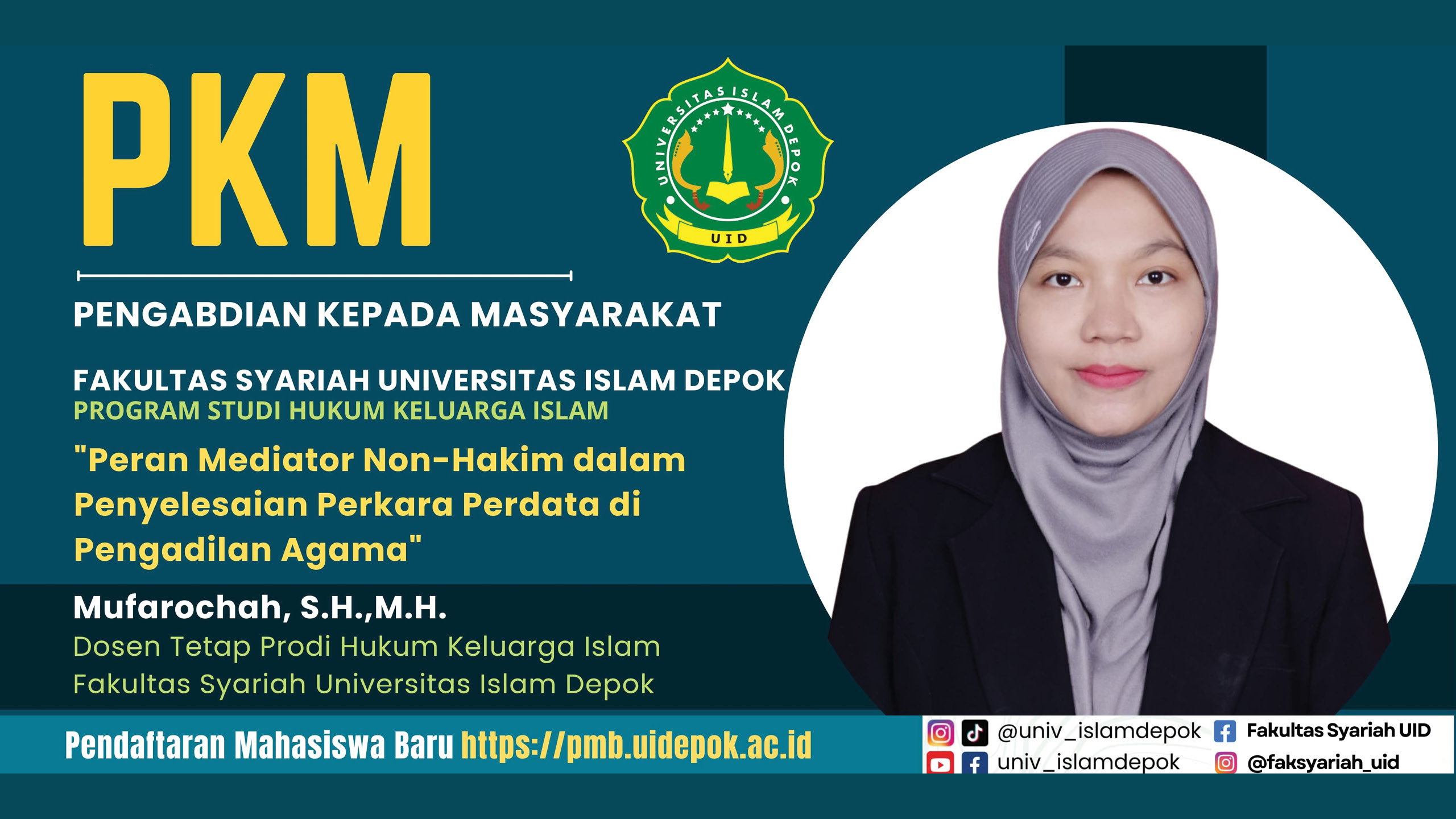 Depok, 23 Mei 2025 — Fakultas Syariah Universitas Islam Depok (UID), melalui Program Studi Hukum Keluarga Islam, kembali mengadakan kegiatan Pengabdian Kepada Masyarakat (PKM) yang kali ini menyoroti peran krusial mediator non-hakim dalam menyelesaikan perkara perdata di lingkungan Pengadilan Agama. Bertajuk Peran Mediator Non-Hakim dalam Penyelesaian Perkara Perdata di Pengadilan Agama, acara ini digelar secara daring via Zoom Meeting pada Jumat, 23 Mei 2025, pukul 13.30–15.30 WIB.