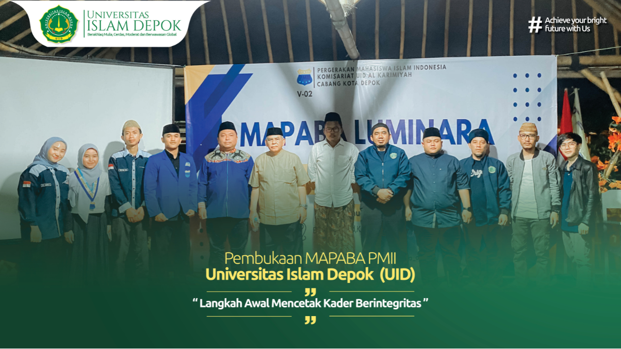 Kemang Bogor, 4 Januari 2025 – Masa Penerimaan Anggota Baru (MAPABA) Pergerakan Mahasiswa Islam Indonesia (PMII) Universitas Islam Depok (UID) resmi dibuka hari ini Jum`at (03 Januari 2025) di Villa Bedugu Rod Kemang Bogor, dengan tema ``MAPABA Luminara``, yang berarti ``Cahaya Harapan``. Kegiatan ini dihadiri oleh tokoh-tokoh penting, di antaranya Pimpinan Yayasan Pesantren Al-Karimiyah, Dr. KH. Ahmad Damanhuri, M.A., Wakil Rektor 2 UID, Dr. H. Alip Nuryanto, M.Hum., Kepala Program Studi Pendidikan Agama Islam, Dr. Ahmad Sujai, serta beberapa narasumber dan ketua komisariat serta pengurus Ikatan Alumni PMII.